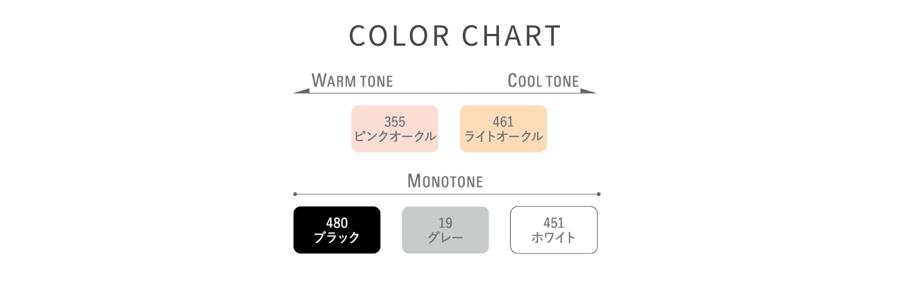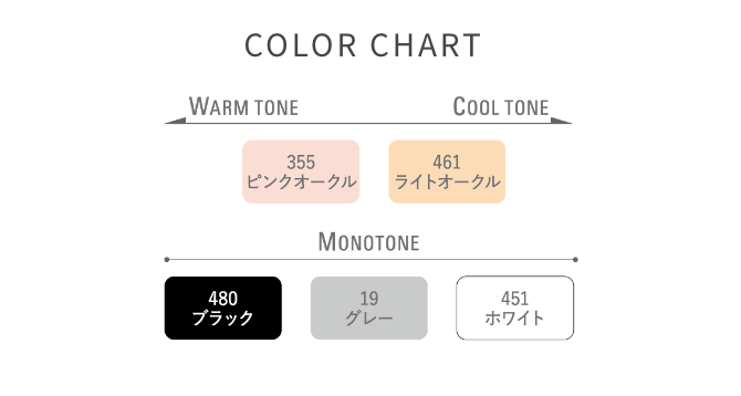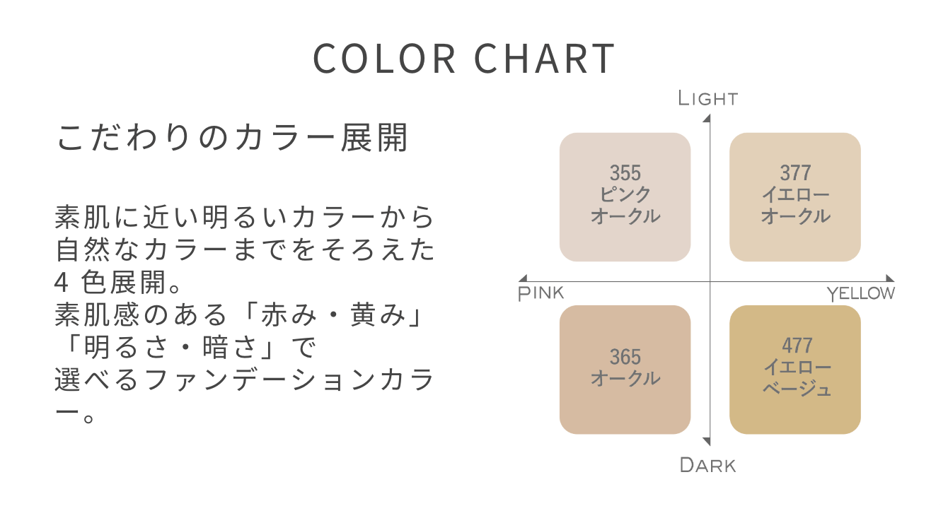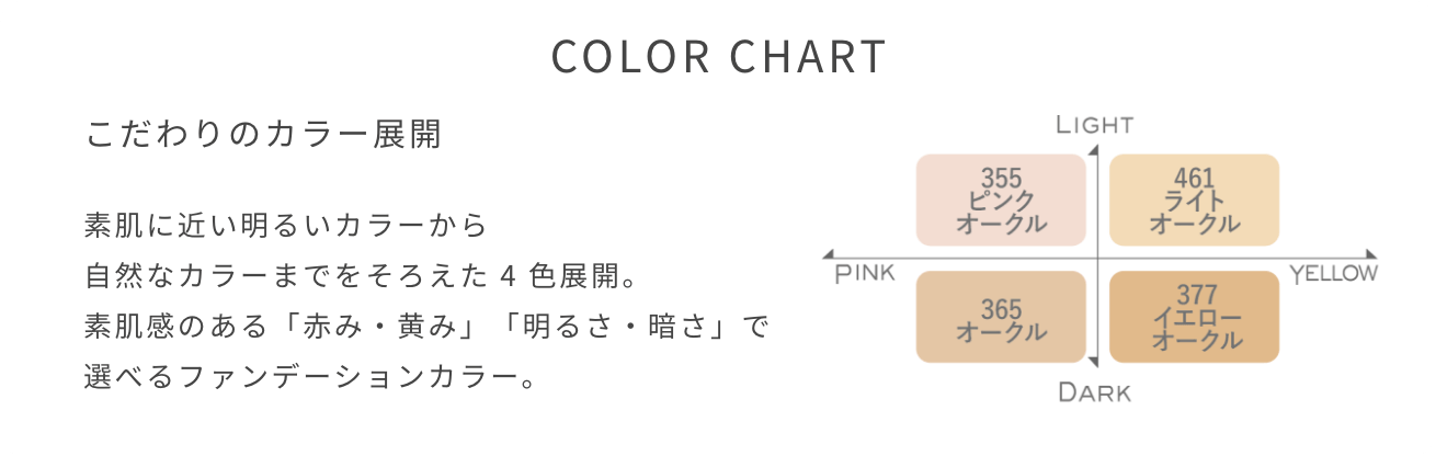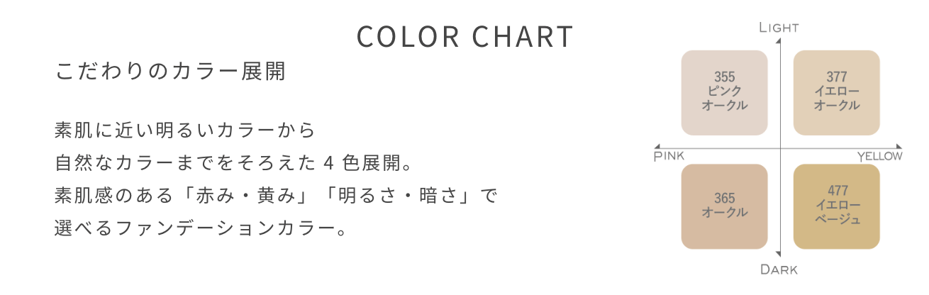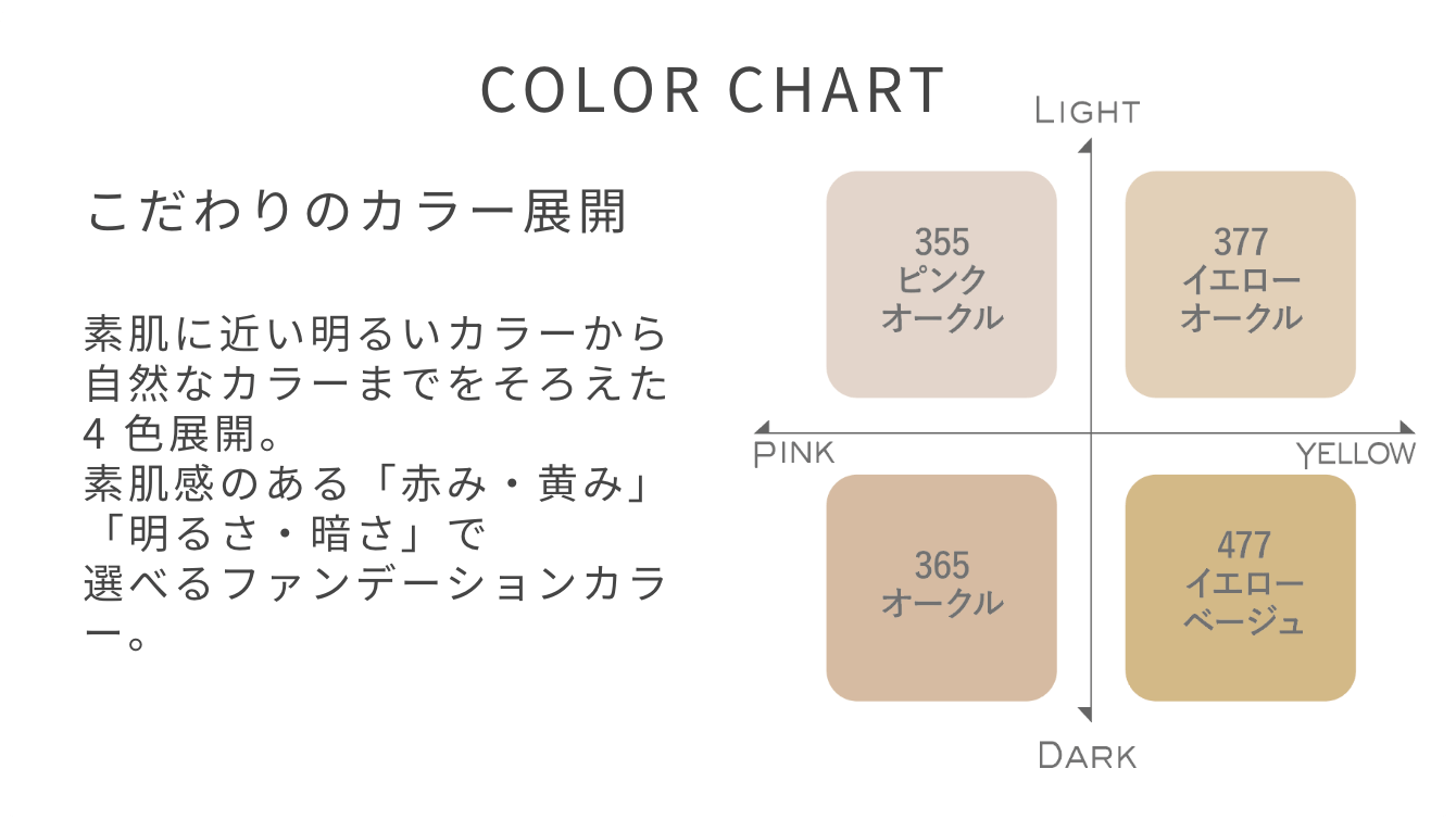 「赤み・黄み」「明るさ・暗さ」の軸でファンデーション感覚で選べるこだわりのカラー展開