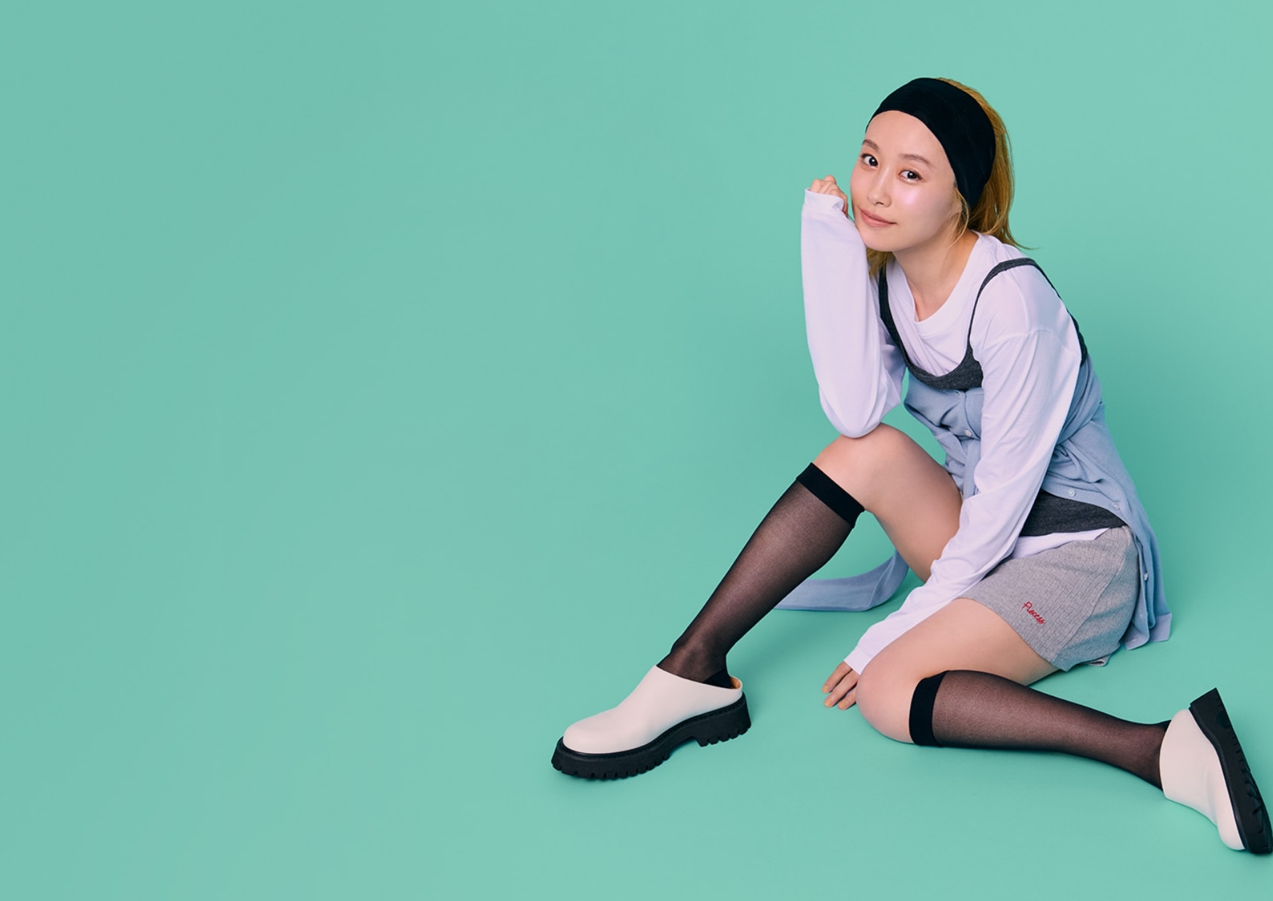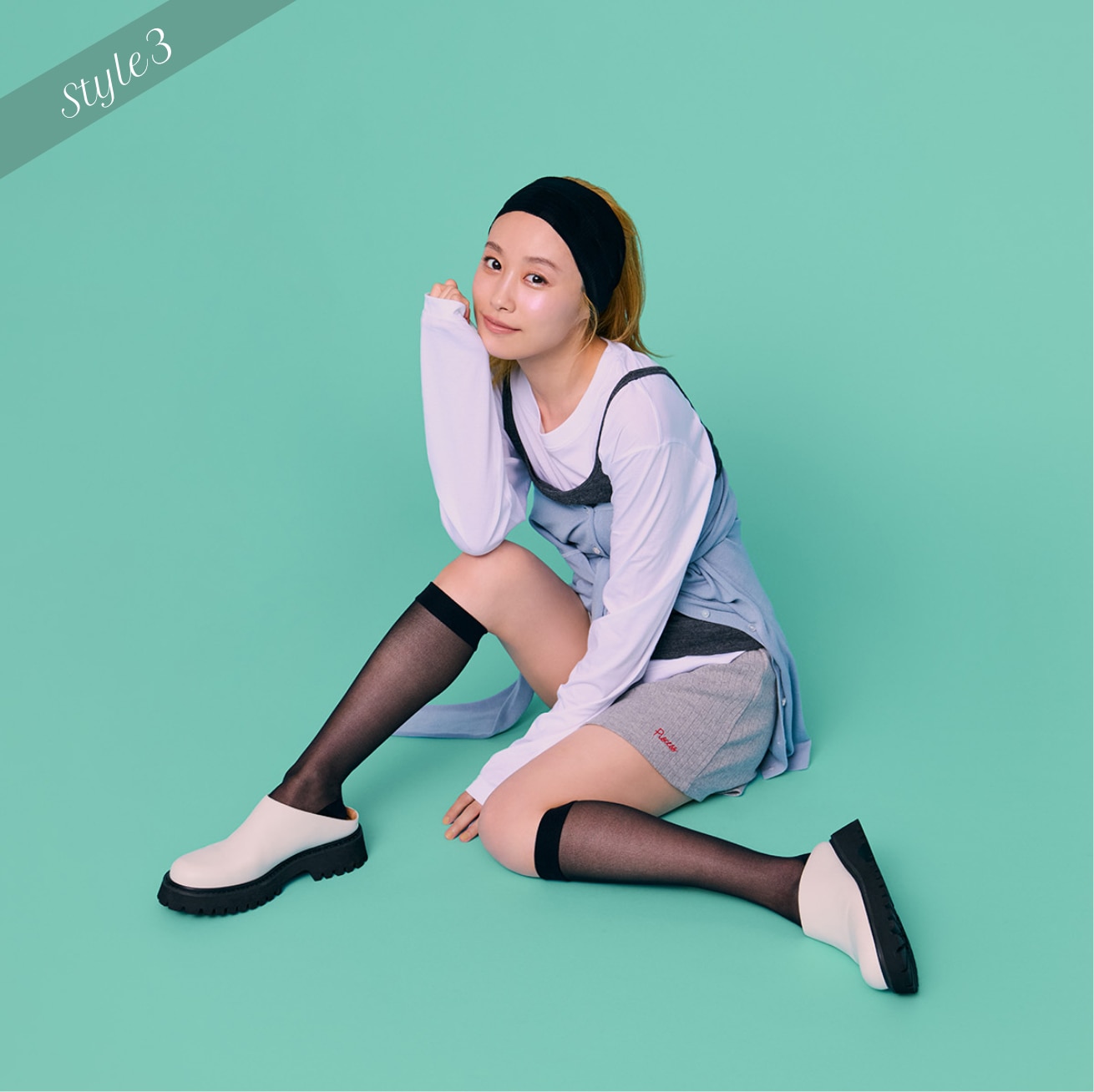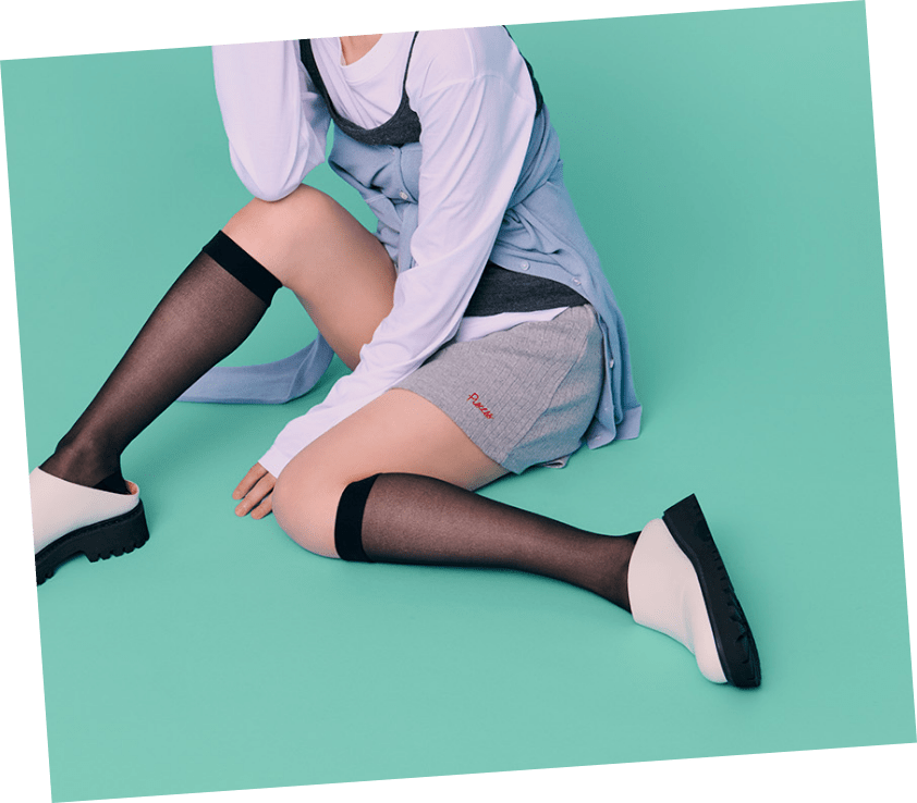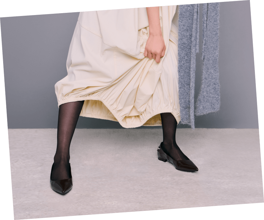 毛穴やくすみをカバーしつつ、自然な素肌感を演出するシアータイツに、ソックスはグレーを選ぶことでコーディネートの差し色に。