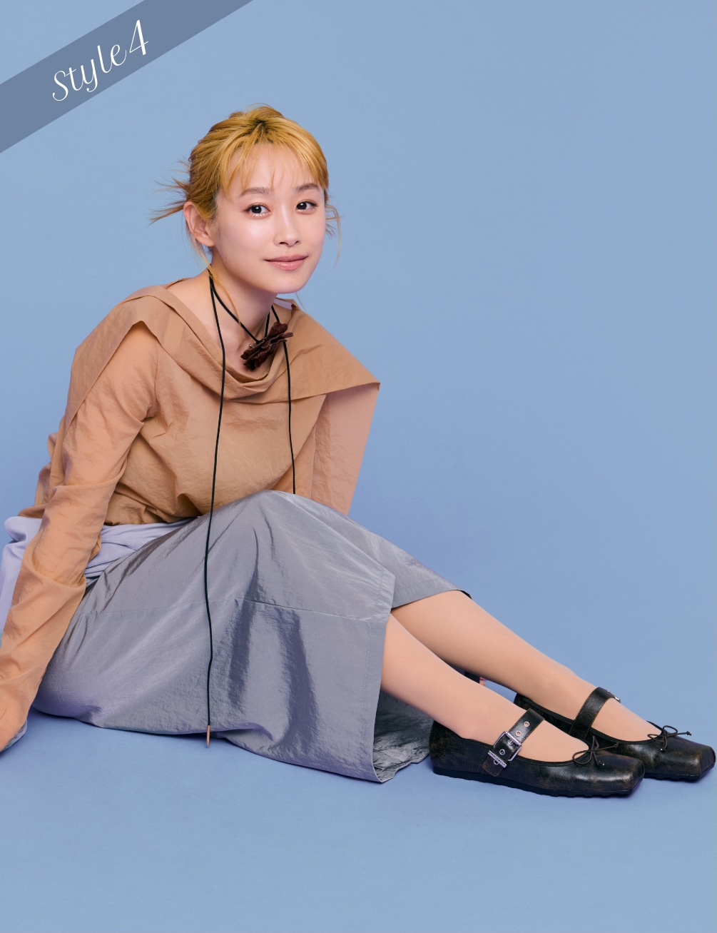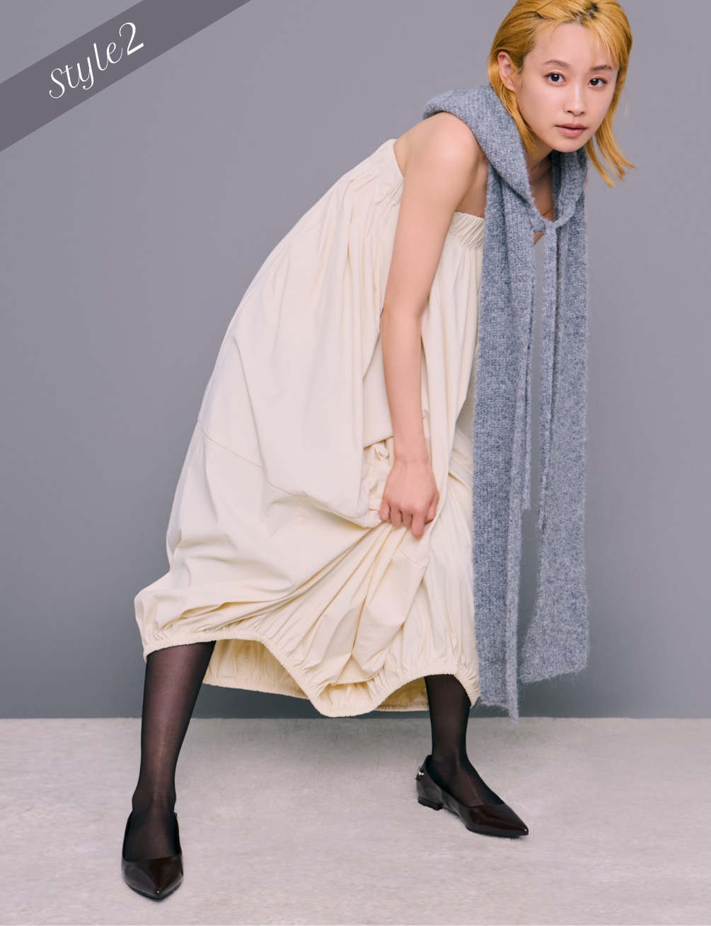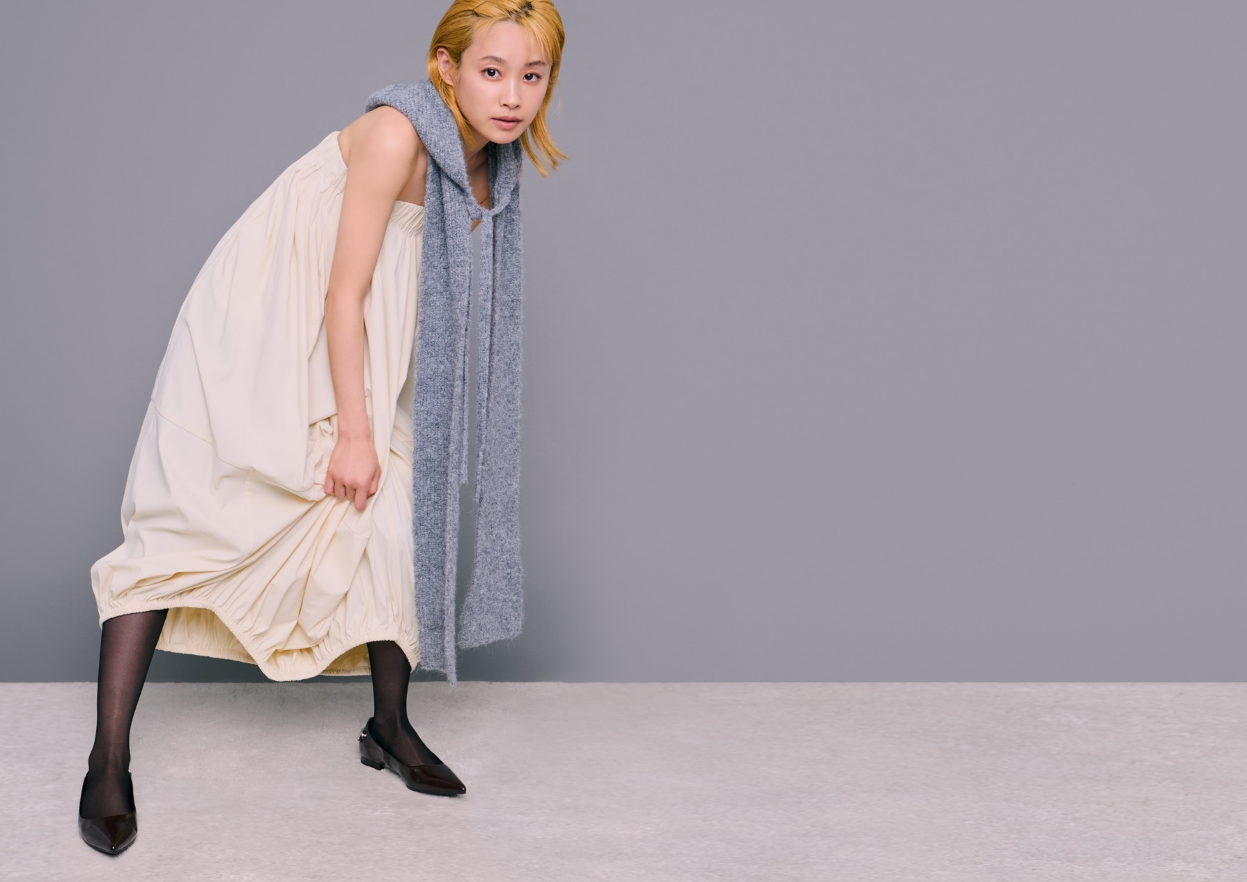毛穴やくすみをカバーしつつ、自然な素肌感を演出するシアータイツに、ソックスはグレーを選ぶことでコーディネートの差し色に。