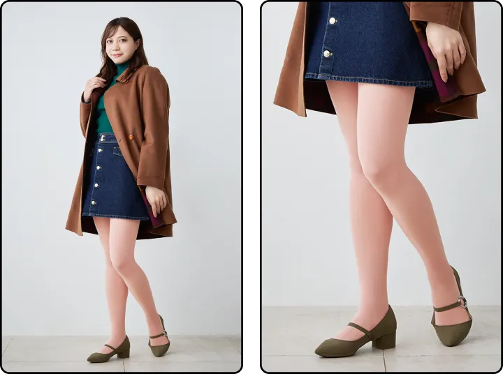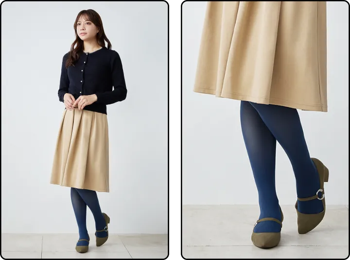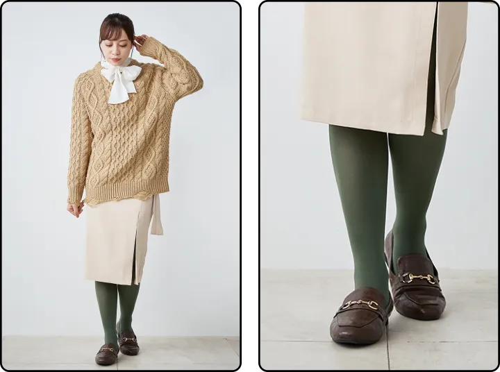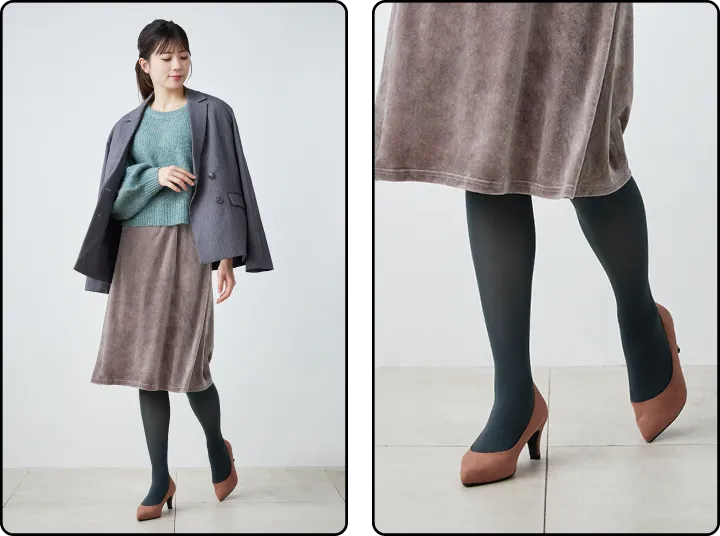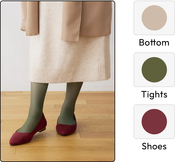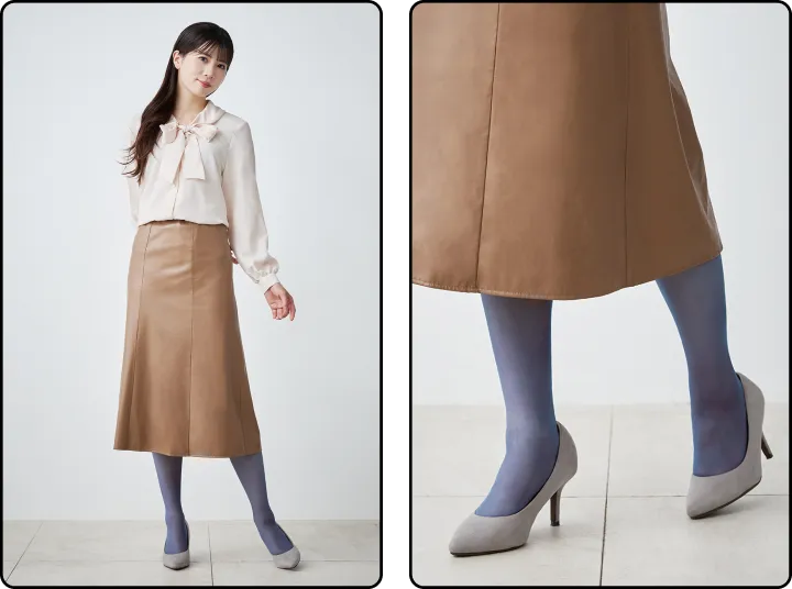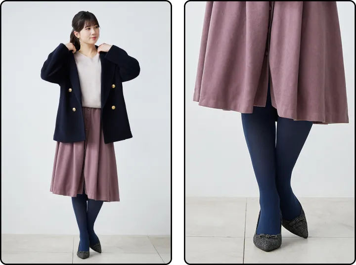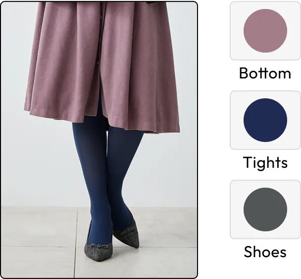 ミディアムブルーのタイツは、深みがありながらも重たくならない絶妙カラー。ベージュのボトムを合わせることで、柔らかさと知的さを兼ね備えた大人の装いに。足元に深めのグリーンを効かせれば、全体に自然味のある深みが生まれ、落ち着きある印象に。全体をニュアンスカラーでまとめるのがおすすめです。