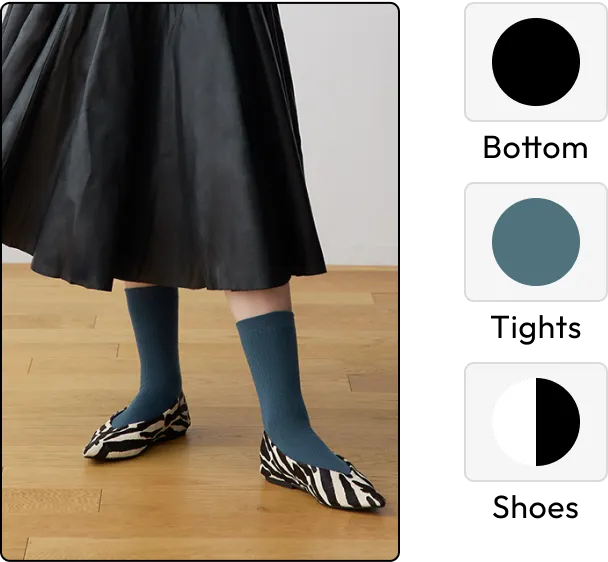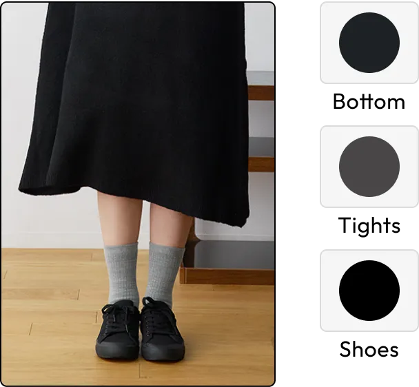 スモーキーアクアのタイツが、モノトーンコーデに知的な彩りをプラス。グレーボトムとスモーキーアクアのタイツが生み出す寒色系のグラデーションが、静かで知的な印象を演出します。ブラックのシューズを加えれば、コーデがグッと引き締まり、ほどよくモードな仕上がりに。コーデのマンネリ打破にもおすすめの配色です。