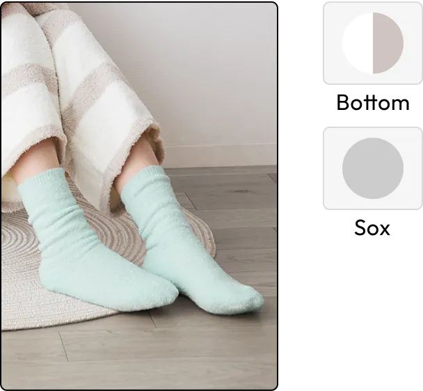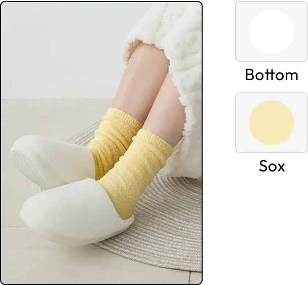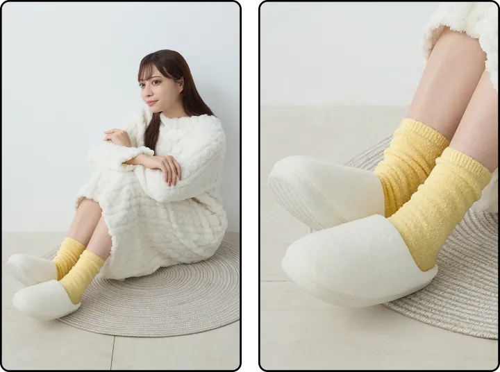 グレイッシュなベージュのルームソックスは、くすみ感のある絶妙なトーンが魅力。アイボリーのボトムと合わせることで、清潔感と温もりが共存する優しげなワントーンスタイルに仕上がります。リラックススタイルにも、落ち着いた美しさと快適さを両立したい方にぴったりな配色です。