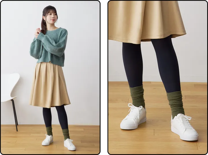カーキのソックスは、ナチュラル感とほどよい辛さを演出できる万能カラー。優しさとこなれ感を同時に叶えるカーキタイツ×ベージュカラーボトムの組合せで、温もりのある秋冬らしい配色に。足元をモノトーンで引き締めることで洗練さがプラスされ、大人のカジュアルスタイルがワンランクアップします。