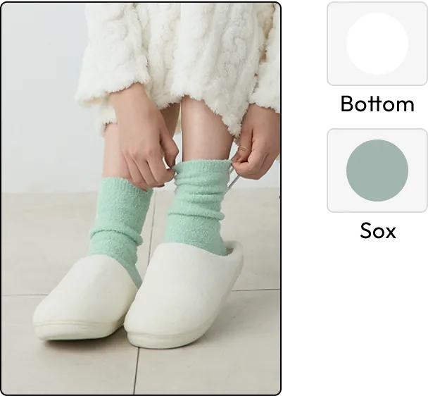 穏やかなグリーンが魅力のペールグリーンカラーのソックスは、ホワイトやアイボリーのボトムと合わせることで、清潔感とやわらかさが際立ちます。色味を抑えたトーン同士の組み合わせが、視覚的にも心地よく、おうち時間にぴったりのリラクシーで品のあるスタイルに仕上がります。