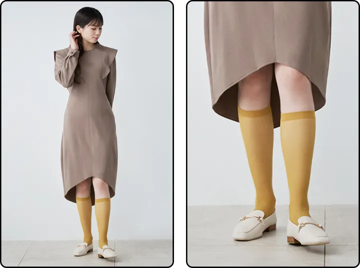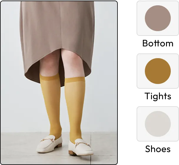 深みのあるマスタードイエローのタイツやソックスは、足元に秋らしい彩りを添えてくれる主役級アイテム。ベージュやブラウン系のボトムと合わせれば、ナチュラルなグラデーションが生まれ、やわらかくも華やかな印象に。靴はアイボリーで軽やかに、またはブラウンで引き締めても◎。控えめなのに印象的な大人配色です。