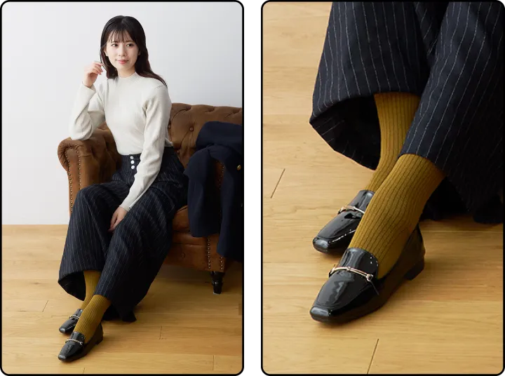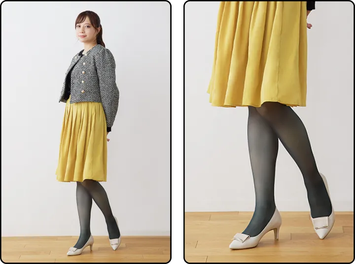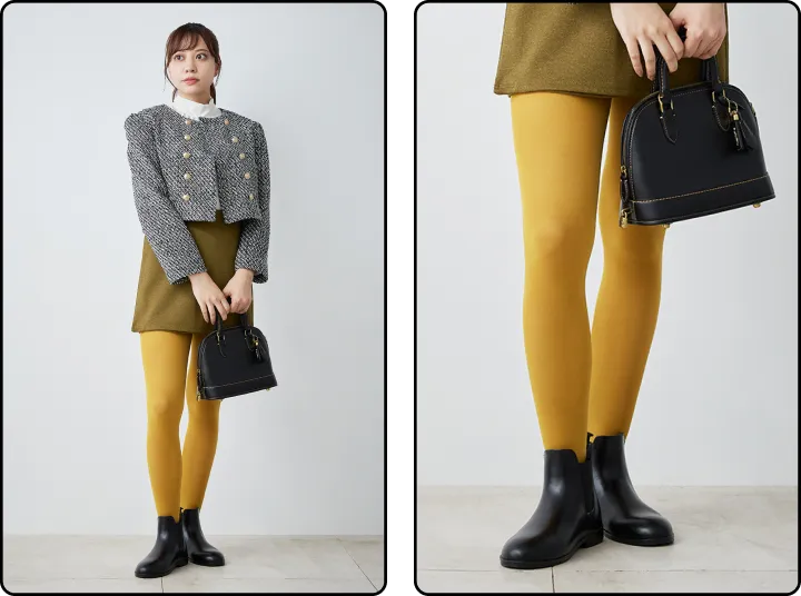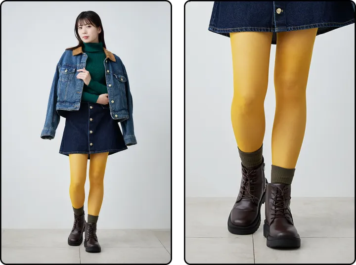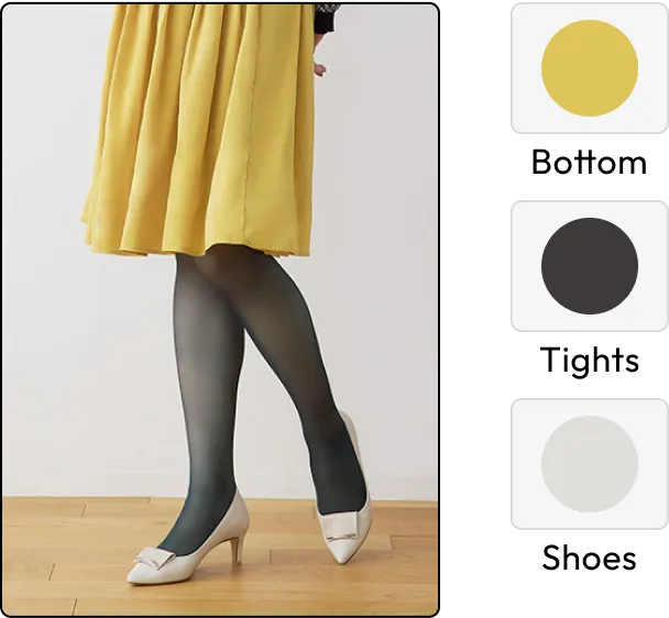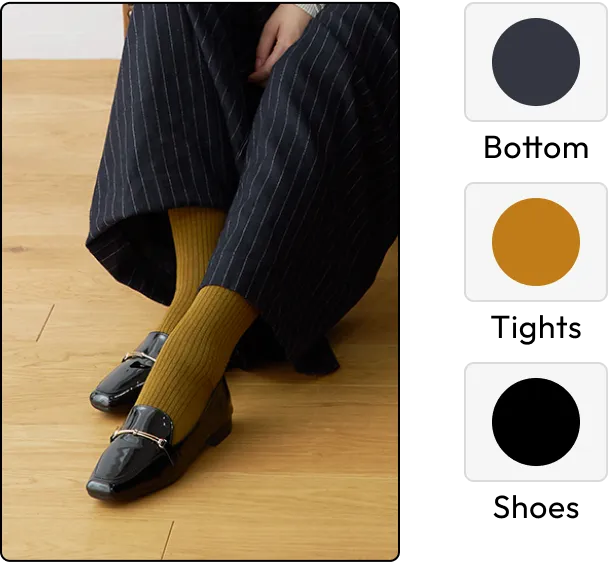 ディープチャコールのタイツが鮮やかなイエローのボトムを程よく引き締め、大人の華やかさを演出。ホワイト系の足元が抜け感をプラスし、秋冬コーデに軽やかさを添えます。濃淡のコントラストでメリハリが生まれ、視線を自然に誘導するため、すっきりとしたスタイルアップも叶う絶妙な配色バランスです。