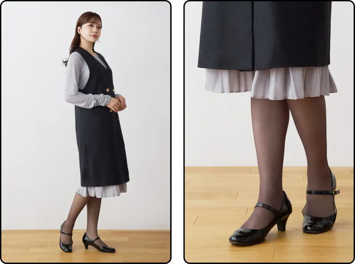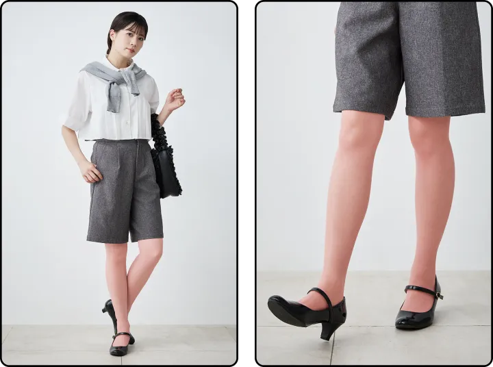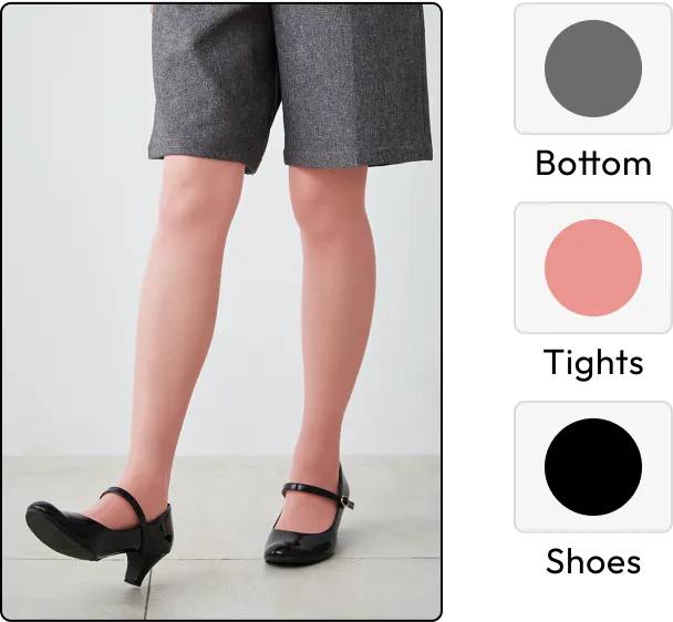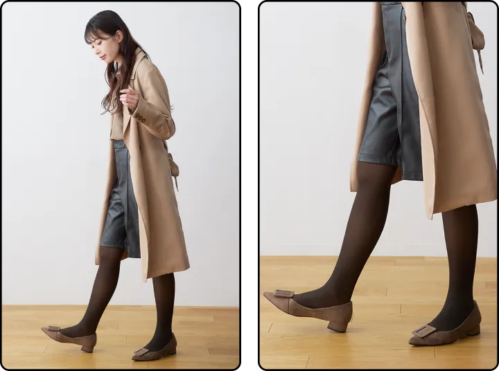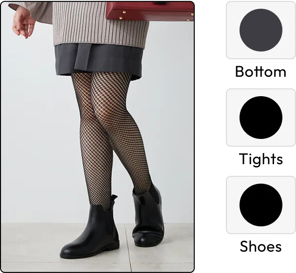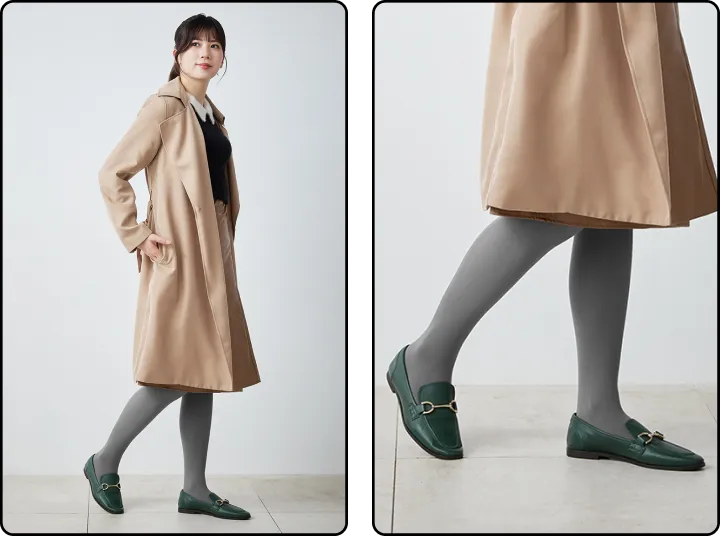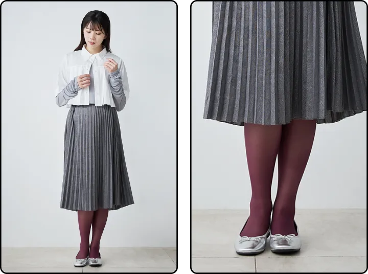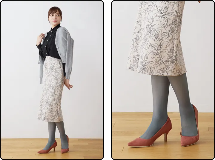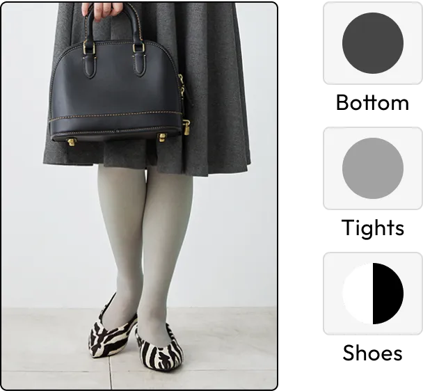 やわらかなニュアンスを持つアッシュグレーのタイツは、同系色のグレーボトムと合わせることで自然なグラデーションが生まれ、脚長効果に。モノトーンシューズを添えれば、洗練された印象をキープしつつ、きちんと感もしっかり確保。色味を抑えた分、シルエットや素材感で魅せる大人のスタイルが完成します。