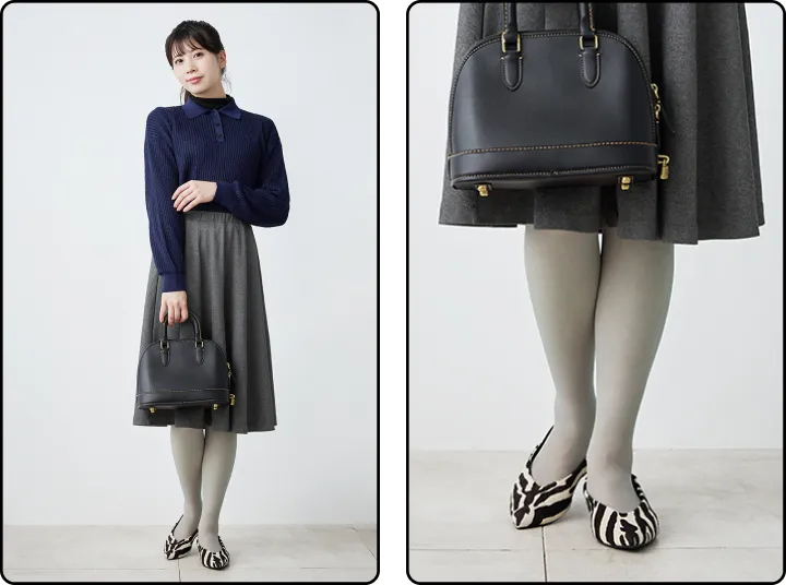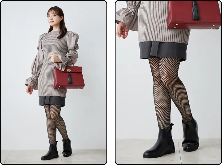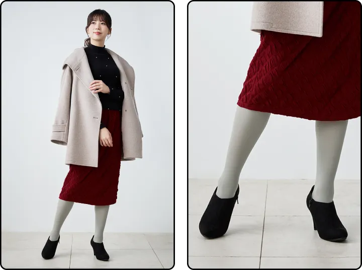 グレーボトムにブラックタイツを合わせることで、落ち着いた中にも洗練された印象に。足元までブラックで揃えることで、縦のラインが強調され、すっきりとした美脚効果も期待できます。繊細さと凛とした強さが共存する、上品なモノトーンスタイルに。冬の定番としてぜひ取り入れてみてください。