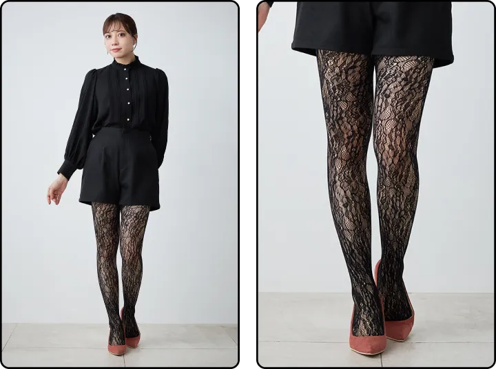 レースのような繊細な柄が、華やかで脚もとの存在感を引き上げます。ワンランク上のおしゃれを楽しんで。