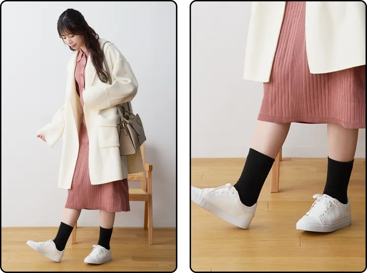 くすみ系のパウダーピンクカラーのソックスに、ピンク系のボトムを合わせれば、ワントーンのようなまとまりがありながらも奥行きのある印象に。ホワイトを選べばより清潔感が増し、ソックスの色味が上品に引き立ちます。可愛らしさと落ち着きのバランスが大人にちょうどいい組み合わせです。