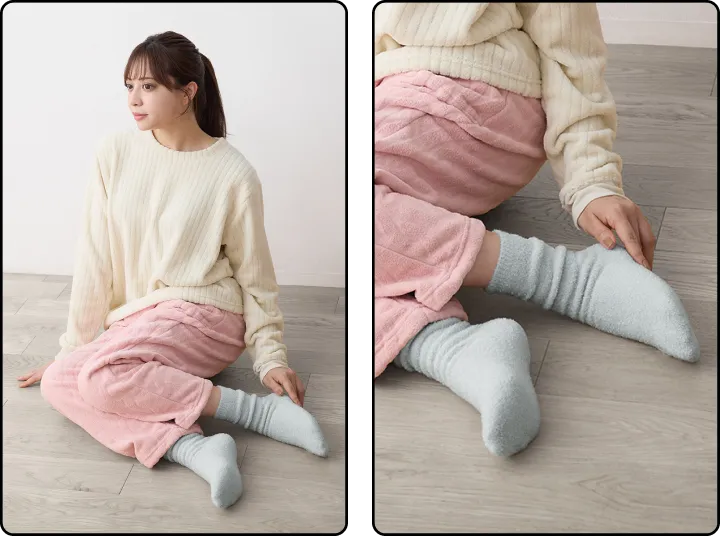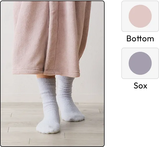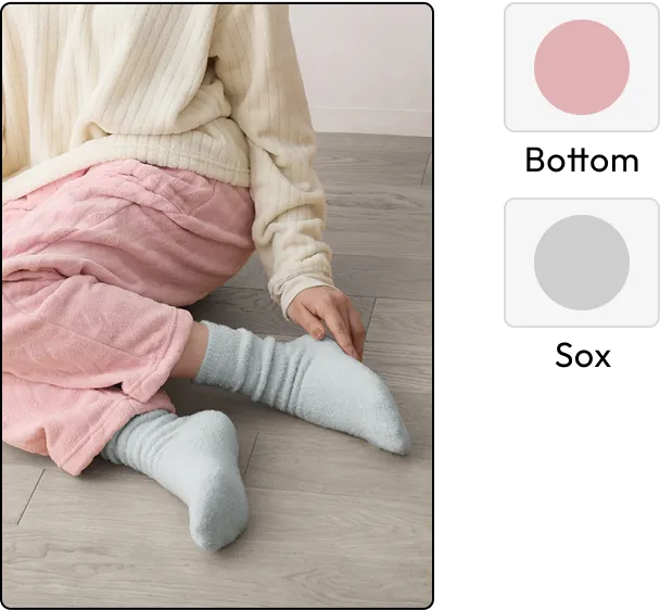 優しいライトグレーのルームソックスは、どんな色ともなじみが良く、特にパステルピンクとの組み合わせは癒し効果抜群。淡いトーン同士がつくるやわらかな空気感は、おうち時間をより心地よく演出してくれます。大人っぽさをキープしつつ、ほどよいかわいらしさを演出したい方にぴったりのカラーリングです。