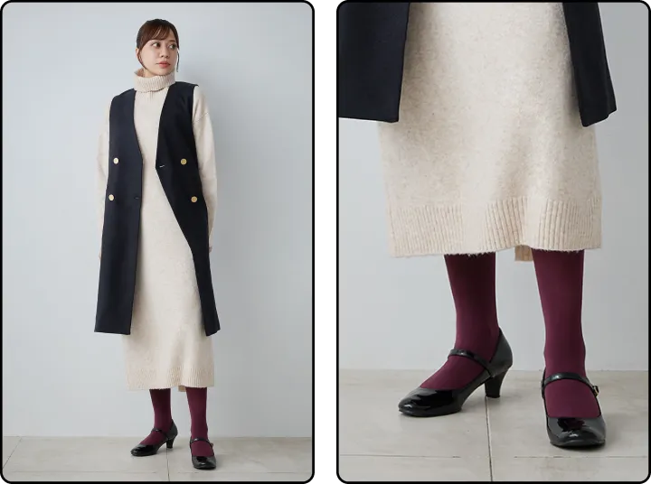 深みのあるバーガンディのタイツは、コーデに女らしさと落ち着きを添える名脇役。ベージュのボトムと合わせれば柔らかさが引き立ち、ネイビーのボトムと合わせれば知的な印象に。ブラックのシューズで足元を締めれば、コーデ全体に程よい重厚感が加わり、気品漂う冬のおしゃれが完成します。