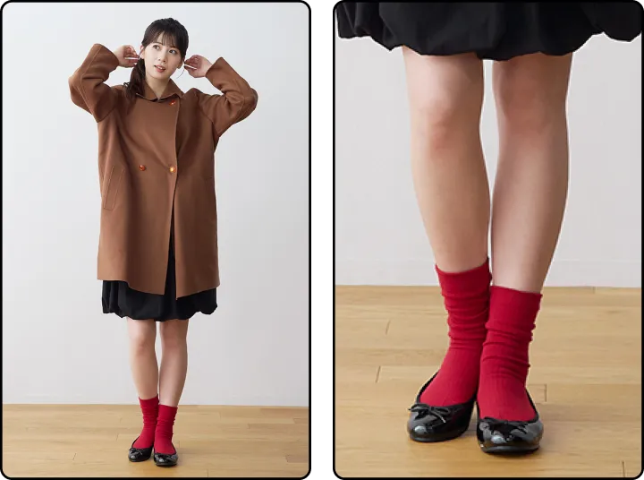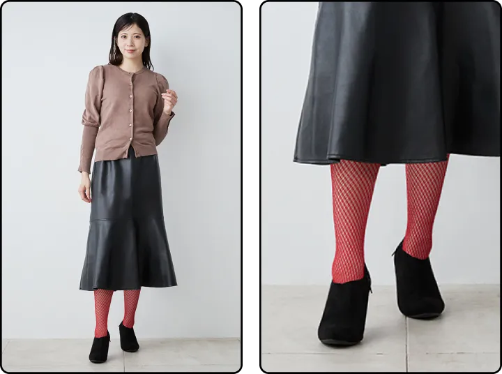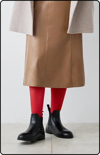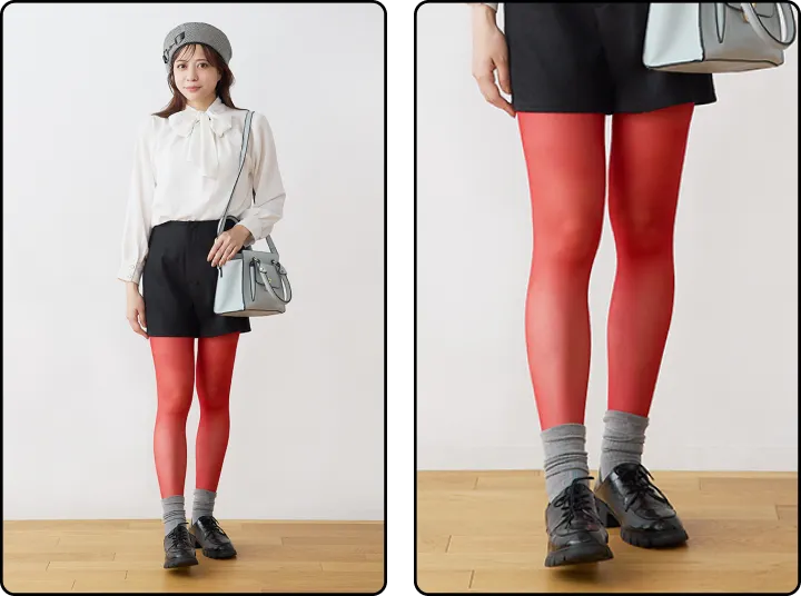 情熱的で品のある深みレッドのタイツは、コーデのアクセントとして最適です。ブラウンのボトムと合わせることで、レッドの主張をほどよく中和し、派手すぎずチュラルに溶け込む秋冬らしい深みのあるコーデに。ブラックのシューズが都会的な雰囲気を演出し、旬と品格を兼ね備えた秋冬の洗練スタイルにしてくれます。