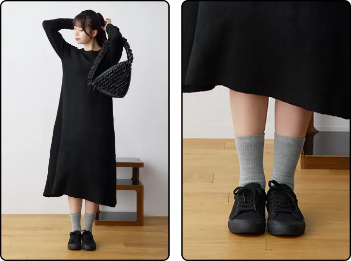 ブラックのボトムとシューズで統一感を出しつつ、杢グレーのソックスを挟むことで、ほどよい抜け感と柔らかさを演出。淡いグレーのトーンが足元に軽さを加え、全体のバランスを調整し、大人のカジュアルスタイルに。素材感のある杢グレーなら、より季節感もプラスでき、デイリーにも通勤にも応用できる万能配色です。