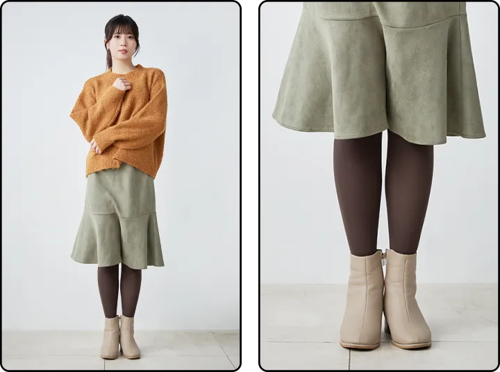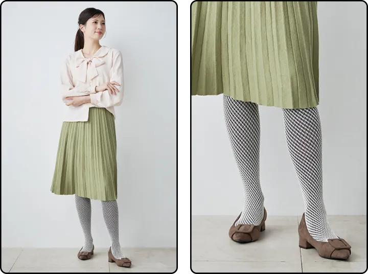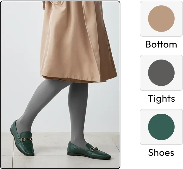 ミディアムグレーのタイツは、黒より軽やかで抜け感があり、ブラウンボトムとの相性も抜群。落ち着いたトーン同士が品よく調和し、大人の女性らしい知的な雰囲気を演出します。足元にグリーン系の靴を合わせれば、さりげなく個性が光るスタイリングに。季節感のある上級配色に仕上がります。