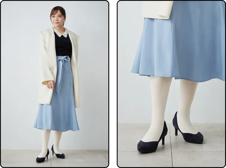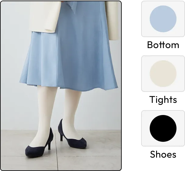 やさしいトーンのミルキーホワイトタイツが、水色などのブルー系ボトムの清涼感を引き立て、洗練された透明感を演出。爽やかで軽やかな印象に仕上がります。ダークネイビーのシューズで全体を引き締めれば、淡い色味の中にメリハリが生まれ、上品で洗練された大人のカジュアルスタイルに。