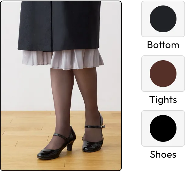 甘さと抜け感を同時に叶えたいときにおすすめなのがこの配色。まろやかなアイボリーにベージュの靴を合わせれば、優しげなトーンが完成。そこに透け感のあるダークグレーのタイツを加えることで、足元にほどよい重厚感と引き締め効果が加わり、全体のコーデがきりっとまとまります。日常使いにもぴったりな好バランスです。