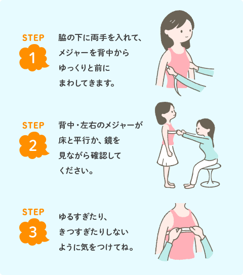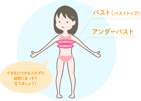 バスト(ふくらみの一番高いところ)とアンダーバスト(ふくらみのすぐ下)をはかります。まだふくらみがない場合、アンダーバストはふくらみがはじまりそうな場所を予測して測りましょう。