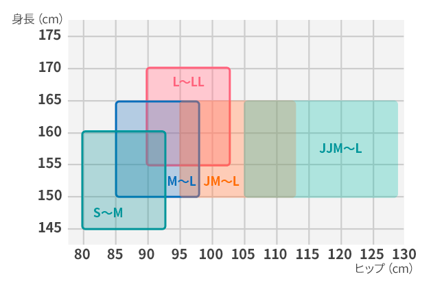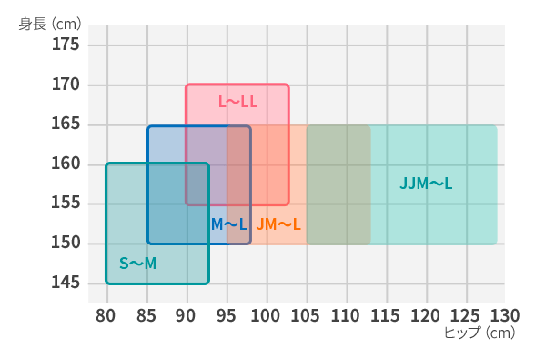 たとえば、ヒップ89cm、身長161cmなら、「M~L」がジャストフィットのサイズです。