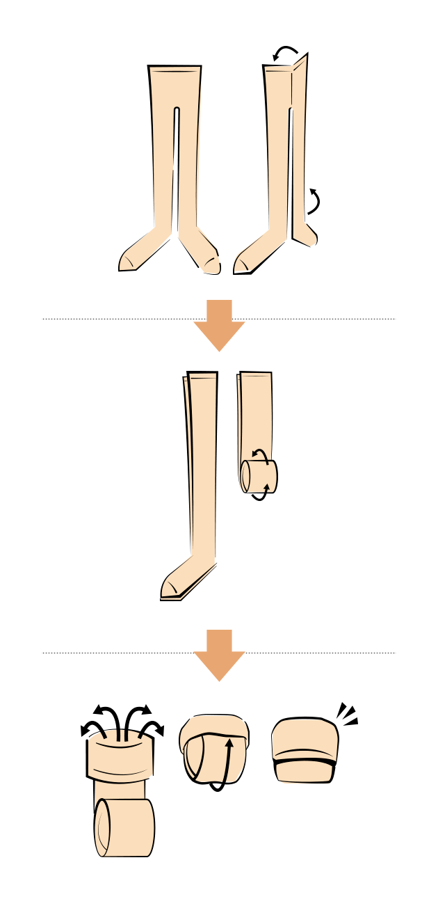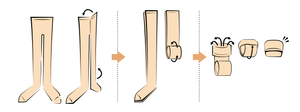 この方法なら、引き出しに並べやすい形でコンパクトになります。そのため選ぶ際も、色柄が分かりやすいため、取り出しやすくなります。また、伝線しにくいウエスト部分が外側にくるのでストッキングを傷めにくいというメリットもあります。