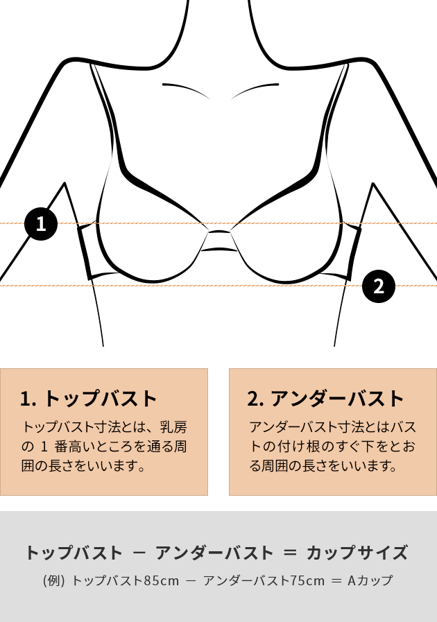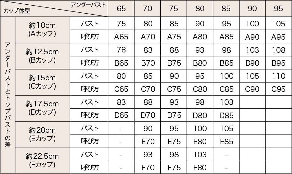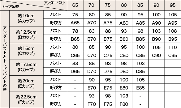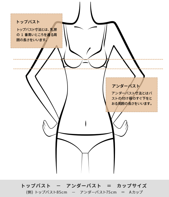 カップサイズはトップバスト寸法とアンダーバスト寸法の差で決まります。