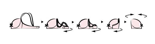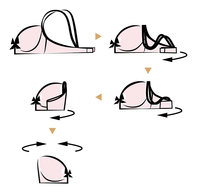 からだを前に倒したまま、左手で左のブラジャーのストラップの付け根を少し浮かせ、右手で左側の乳房を全部包んで、中央へ向かって寄せながらななめ上へ上げる。乳房をカップのなかにおさめ、バストトップとカップトップを合わせて整える。
