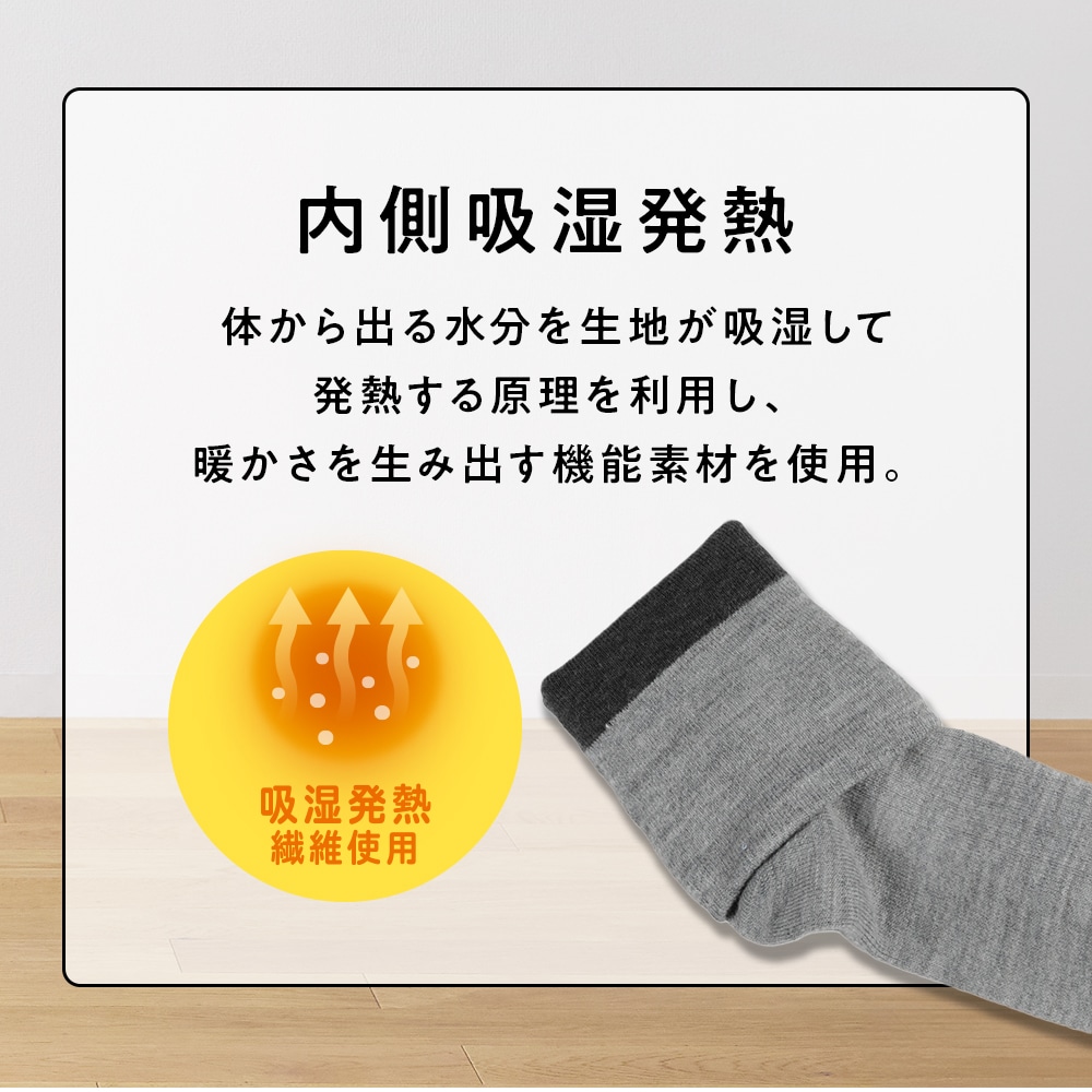 ソックスの内側には吸湿発熱糸を使用。靴のおしゃれを邪魔しない生地の厚みで、秋冬の足元をおしゃれに、快適に。